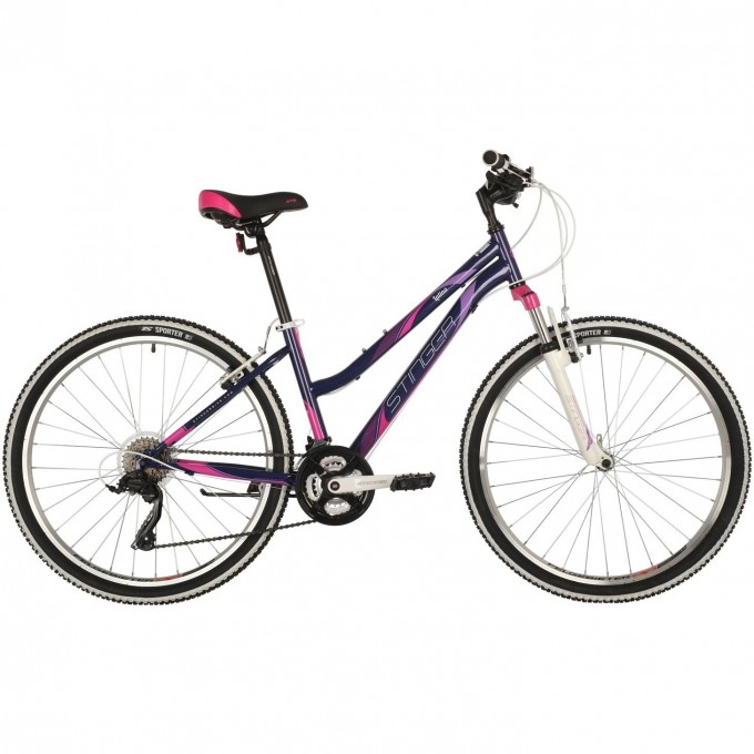 Велосипед STINGER LATINA - это надежный горный велосипед для девушек. Отличительной особенностью модели является комфортная посадка за счет специально заниженной геометрии рамы, широкого мягкого седла и передней амортизационной вилки. Данный байк можно отнести к классу велосипедов начального уровня, рама выполнена из высокопрочной стали. Установлено все необходимое оборудование для комфортного катания трансмиссия состоит из 18 передач, руль регулируется по высоте, установлены классические ободные тормоза типа V-brake, используются двухцветные универсальные покрышки шириной 2.1 дюйма. В комплекте уже установлена защита передней звезды и есть подножка. STINGER LATINA - хороший и недорогой вариант для повседневного использования. Данная модель на колесах 26 дюймов с рамой 15 дюймов в фиолетовом цвете.